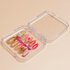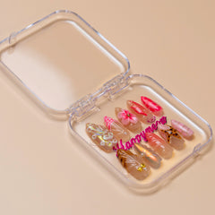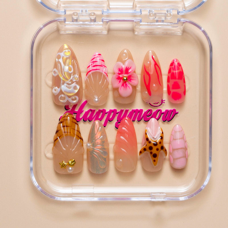 Happymeow 'Fever Dream' features a wild mix of styles, from hot pink swirls and a 3D flower to leopard print cat ears and ornate, gold-accented baroque sculpting on a sheer base.