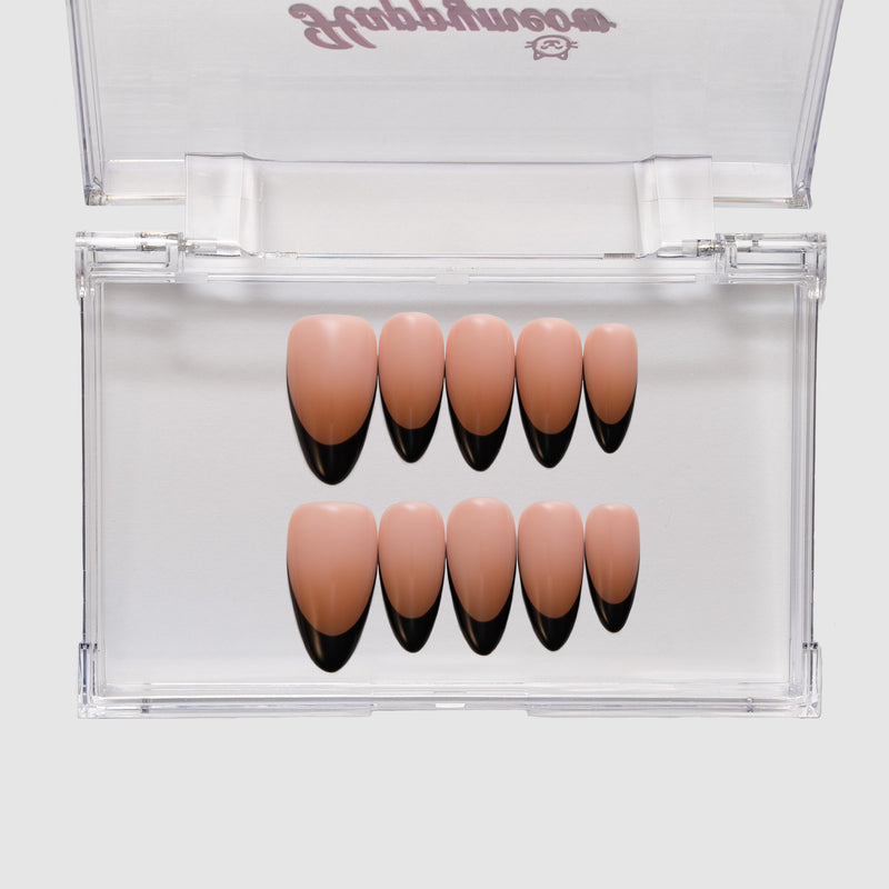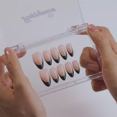 Happymeow 'Noir' features a classic nude base contrasting with a sharp, jet-black French tip. This edgy set redefines tradition for a bold, modern look.