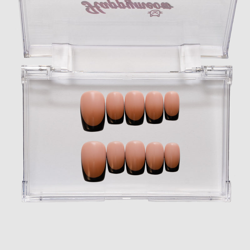 Happymeow 'Petit Noir' features a classic nude base contrasting with a sharp, jet-black French tip. This edgy set redefines tradition for a bold, modern look.